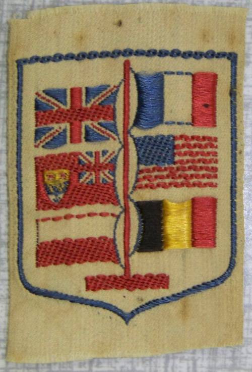 Ruban tissé au jacquard comportant, en bleu, blanc, rouge, jaune et noir sur fond blanc, un écusson habité d’un mât portant six drapeaux (3 à droite, 3 à gauche) représentant les pays suivants : Royaume-Uni, Canada (drapeau colonial en vigueur entre 1931 et 1965), la Pologne, la France, les Etats-Unis d’Amérique et la Belgique.