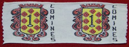 Ruban tissé au jacquard présentant les armoiries de la ville de Comines (Belgique) : "D’or à une clef de sable mise en pal, le panneton en haut et à dextre, et accompagnée de huit quintefeuilles de gueules, trois à dextre, trois à senestre et deux en pointe”.