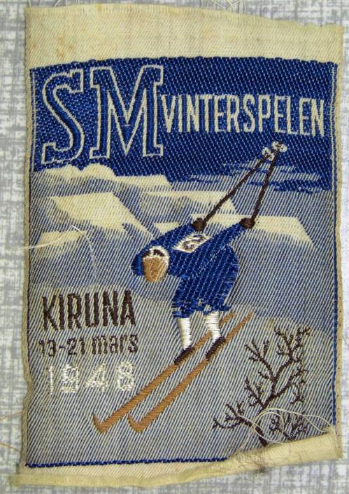 Ruban tissé au jacquard comportant, en bleu, blanc, brun, beige et noir, un acdre rectangulaire frappé des inscriptions sur plusieurs lignes “SM VINTERSPELEN; KIRUNA; 13-21 mars; 1948” entourat un skieur tout schuss dans un paysage montagneux.