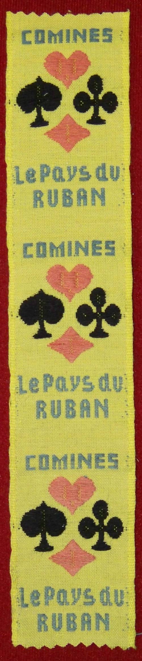 Ruban tissé au jacquard portant, sur fond jaune, les inscriptions, en vert, “COMINES; Le Pays du; RUBAN” entrecoupées de quatre figures disposées deux à deux : un pique et un trèfle noirs et un carreau et un coeur rouges.