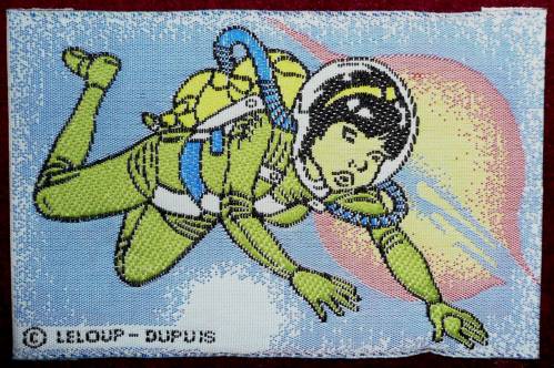Ruban tissé au jacquard présentant en multiples couleurs, une représentation du personnage de bande dessinée Yoko Tsuno habillée d’un scaphandre spatial, planant dans l’espace devant une planète entourée de son anneau.