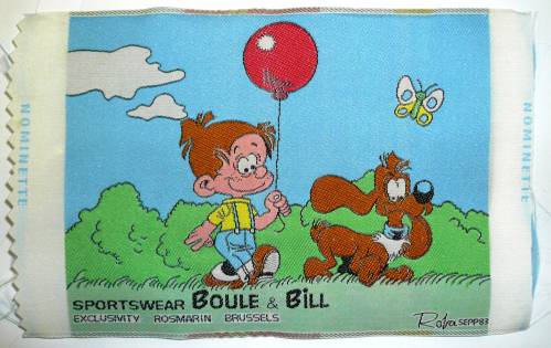 Ruban tissé au jacquard reproduisant une vignette de la bande dessinée “Boule et Bill”.