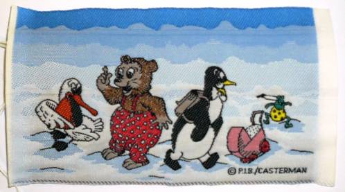 Ruban tissé au jacquard présentant, sur un paysage de banquise, les personnages de la série de bande dessinée Petzi (Petzi, l’ours, entouré d’un pélican, d’un pingouin et d’une souris lâchant son landau.