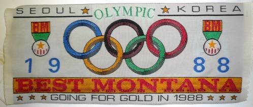 Ruban tissé au jacquard comportant, en noir, vert, rouge, jaune, marron et bleu, les inscriptions sur cinq lignes “SEOUL OLYMPIC KOREA; BM BM; 1988; BEST MONTANA; GOING FOR GOLD IN 1988” autour des anneaux olympiques et de deux médailles.