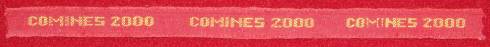 Ruban de type “nominette” tissé au jacquard et présentant, en lettres jaunes sur fond rouge, les inscriptions : “Comines 2000”.