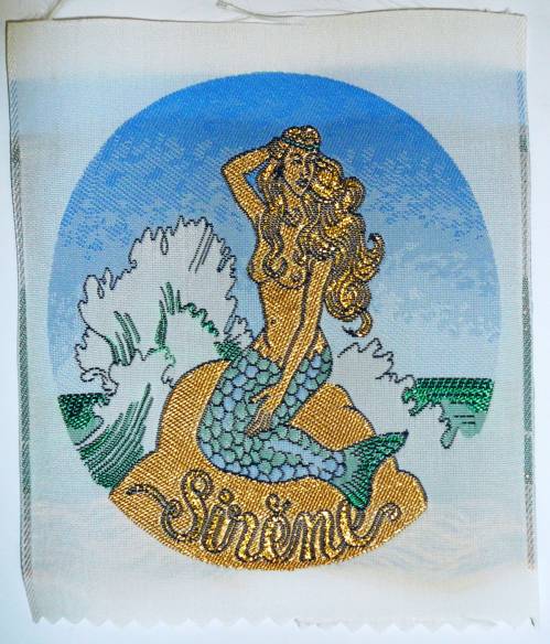 Ruban tissé au jacquard comportant, en bleu, or, vert, beige et blanc, une ovale ayant pour thème une sirène posée sur un rocher que balaye les vagues.