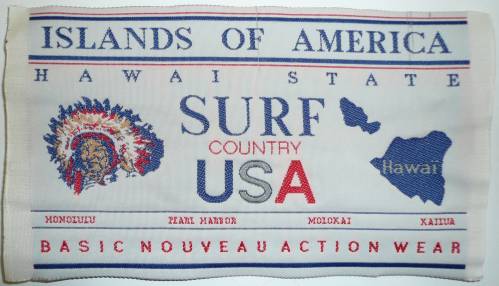 Ruban tissé au jacquard portant en rouge, bleu, beige et blanc une tête d’indien et la silhouette d’Hawaï ainsi que, sur sept lignes, les inscriptions : “ISLANDS OF AMERICA; HAWAI STATE; SURF; COUNTRY; USA Hawaï; HONOLULU PEARL HARBOR MOLOKAI XAILUA; BASIC NOUVEAU ACTION WEAR”.