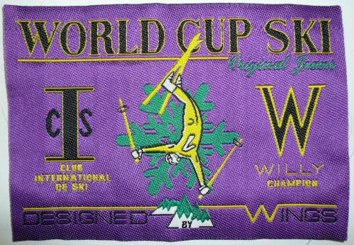 Ruban tisé au jacquard comportant, en mauve, jaune, vert et noir, un skieur en train d’opérer une figure en révolution dans un paysage montagneux et, sur sept lignes, les inscriptions : “WORLD CUP SKI; Original Jean; CIS W; CLUB; INTERNATIONAL; DE SKI; WILLY; CHAMPION; DESIGNED BY WINGS”.