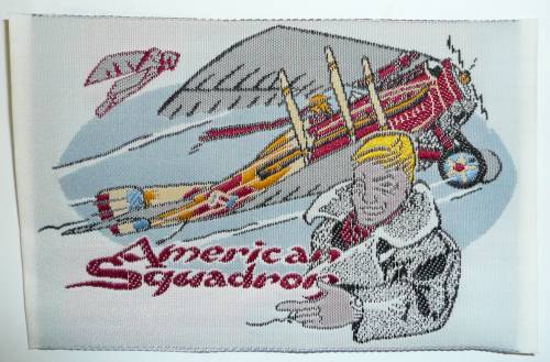 Au premier plan, un personnage masculin vêtu d’une gabardine et d’une écharpe, d’un geste de la main, désigne les inscriptions sur deux lignes : “American; Squadron”.