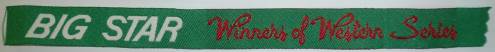 Ruban tissé au jacquard présentant, en blanc et rouge sur fond vert, les inscriptions : “BIG STAR Winners of Western Series”.