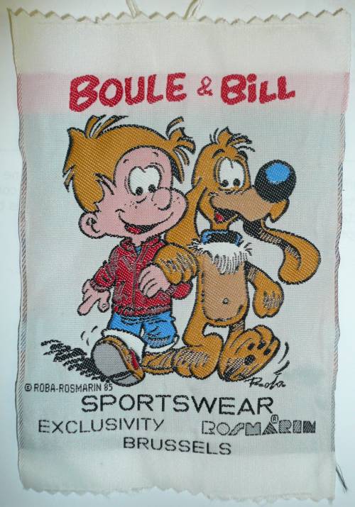 Ruban tissé au jacquard présentant, en rouge, noir, bleu, beige et blanc l’effigie des personnages de bandes dessinées Boule et Bill bras dessus, bras dessous, accompagnées des inscriptions sur cinq lignes : “BOULE & BILL; © ROBA-ROSMARIN; SPORTSWEAR; EXCLUSIVITY ROSMARIN R; BRUSSELS”.