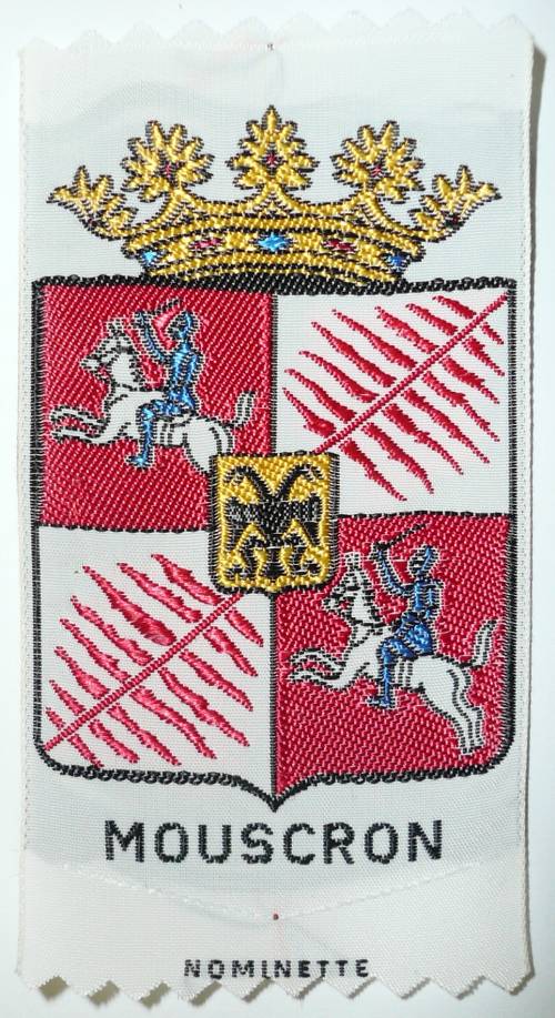 Ruban tissé au jacquard présentant, en rouge, noir, bleu, or et blanc les armoiries de la ville de Mouscron dont la description héraldique est : “écartelé aux 1 et 4 de gueules au chevalier armé de toutes pièces d'azur monté sur un cheval cabré d'argent et brandissant une épée de même, aux 2 et 3 d'argent à une barre hérissée de flammes de gueules, sur le tout, d'or à l'aigle bicéphale de sable, becquée, langée, membrée et diadémée de gueules, surmontée de la couronne impériale”.