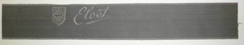 Ruban jacquard comportant, en gris clair sur fond anthracite, l’inscription accostant un blason frappé d’une croix entourée de besants : “Elvet”.