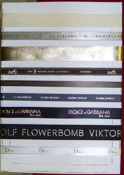 Carton d’échantillons de rubans tissés au jacquard employé par les représentants des usines Dalle de Wervicq-Sud (France) et comportant 9 exemples différents estampillés des marques : “GEORG JENSEN; O MONTBLANC; GUERLAIN Paris; 2007 ENTREZ DANS LA DANSE! HERMES; GUCCI; GEORG JENSEN; DOLCE & GABANA the one; OLF FLOWERBOMB VITKOR; Dior”.