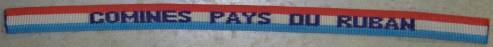 Ruban tisé au jacquard, comportant, sur fond de lignes horizontales rouge, blanc, bleu, les inscriptions en bleu marine : “COMINES PAYS DU RUBAN”.