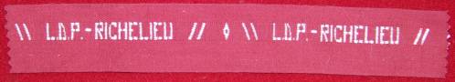Ruban tissé au jacquard à lettres blanches sur fond rouge, portant l’inscription : “\\ L.D.P. RICHELIEU //”.