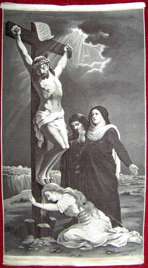 Ruban tissé au jacquard représentant le Christ crucifié pleuré par trois femmes.