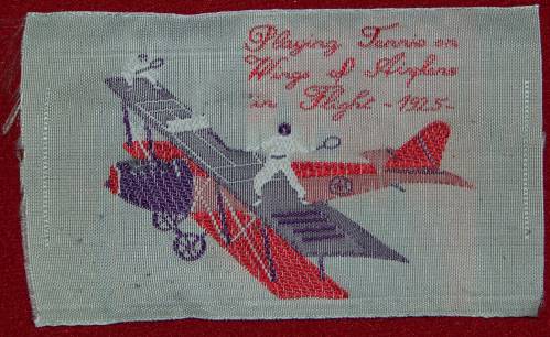 Au-dessus de l’image, un texte, libellé en anglais, précise : “Playing Tennis on; Wings of Airplane; in Flight -1925-”