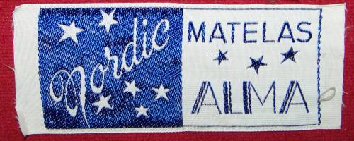 Un autre rectangle d’égale dimension le jouxte et porte, au sein d’un cartouche au liseré bleu marine, les inscriptions en bleu sur fond blanc : “MATELAS; ***; ALMA”.