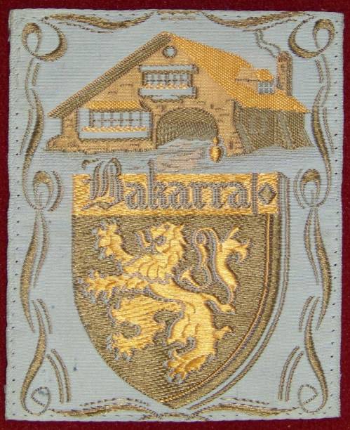 Ruban jacquard multicolore comprenant la représentation, encadrée de volutes, d’une demeure patricienne du Pays Basque et d’armoiries (un écu porte un lion surmonté de la mention “Bakarra” en lettres gothiques).