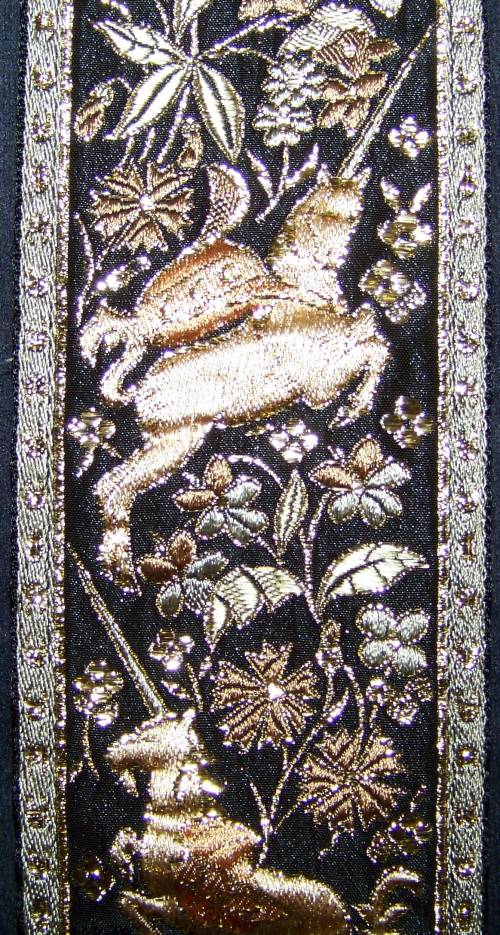 Ruban tissé au jacquard présentant, sur fond noir, un motif de licornes, portant un écu à trois croissants de lune, entourées d’entrelacs végétaux autour d’une lisière à motifs de gouttes et de croissants. Les motifs sont réalisés au fil d’or.
