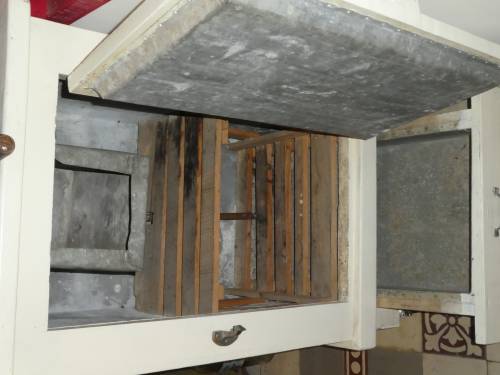Meuble en bois peint en blanc avec porte avec poignée métal, bac métal pour mettre des glacons, munis de roulette