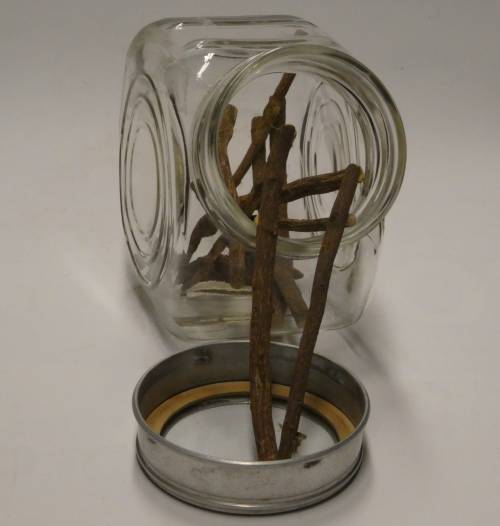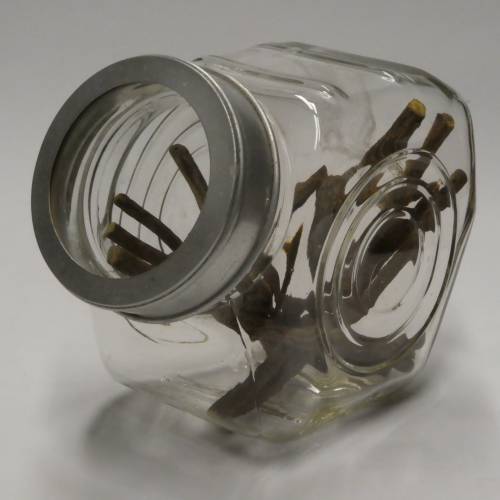 bocal en verre avec couvercle verre et métal pour la présentation de bonbons ou d'aliments pour la vente ici des batons de réglisse