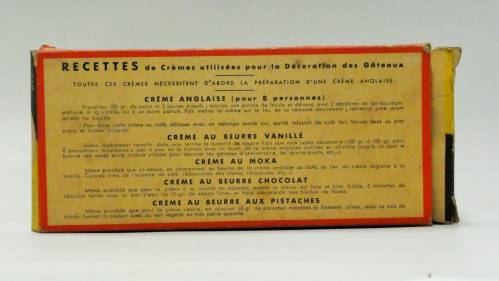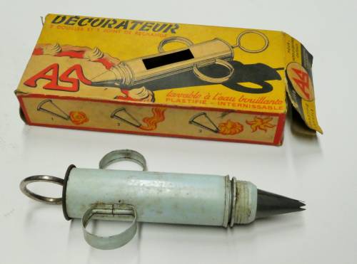 Boite cartonnée ayant contenu une seringue et 7 douilles et un joint de rechange pour la décoration des gateaux et hors-d'oeuvres