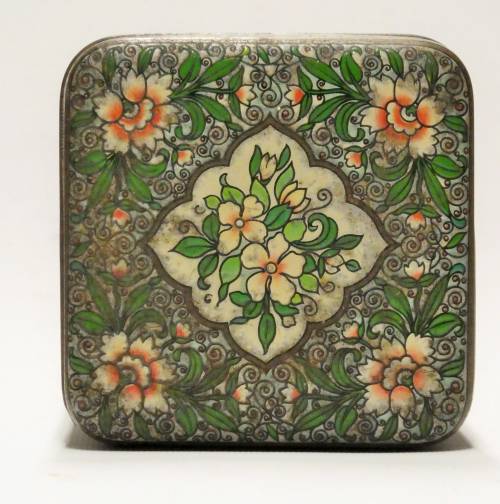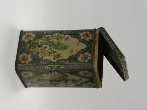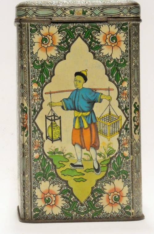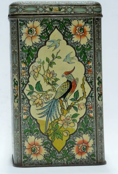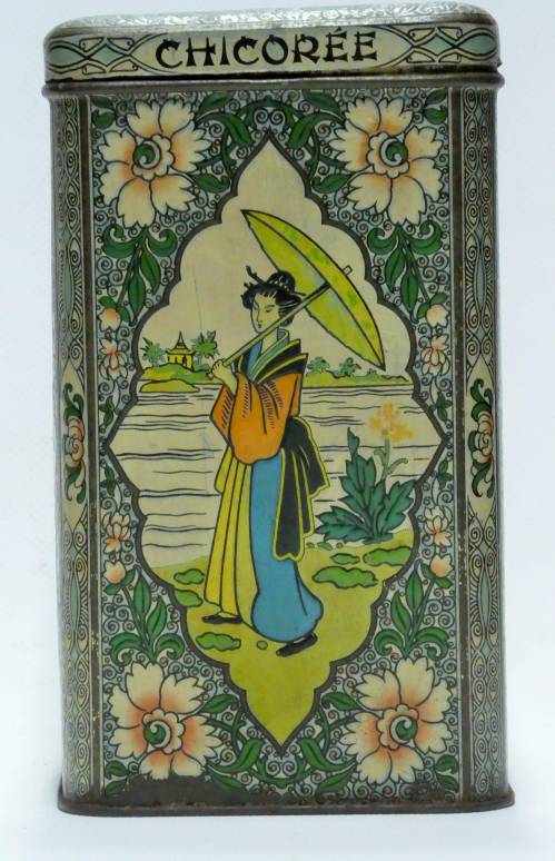 boite en métal peint avec décor japonais ayant contenue des biscuits et servant ensuite pour le rangement de la chicorée