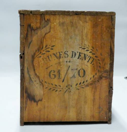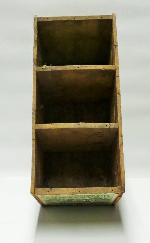 boite en bois rectangulaire avec papier publicitaire sur un coté et à l'intèrieur et plusieurs compartiments