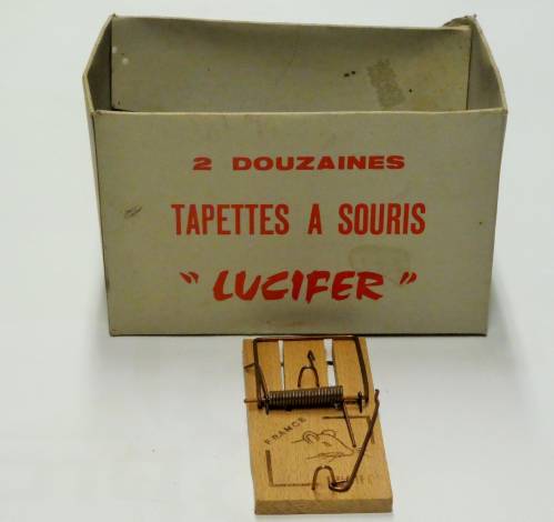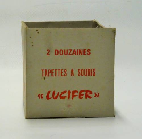 Boite en carton pouvant contenir 2 douzaines de tapettes à souris en bois et piège en métal (il en reste une seule)