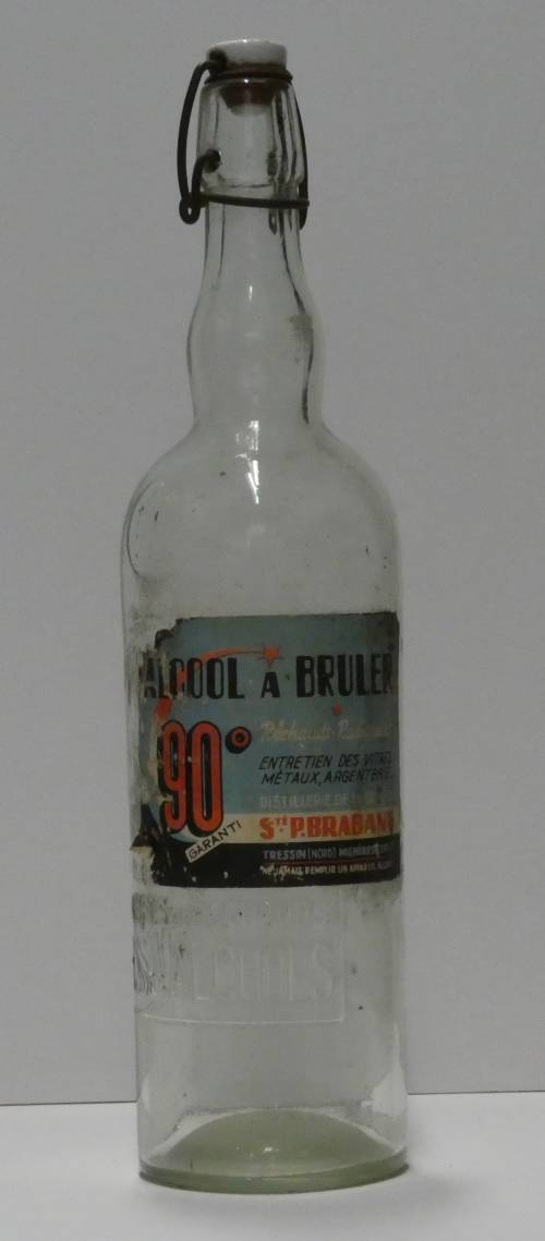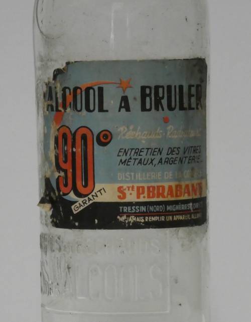 sur l'étiquette : alcool à bruler 90°garanti réchauds, radiateurs, entretien des vitres, métaux, argenterie