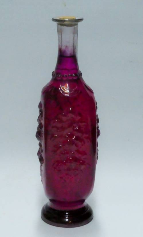 bouteille en verre transparent contenant un liquide rose fermée par un bouchon en liège
