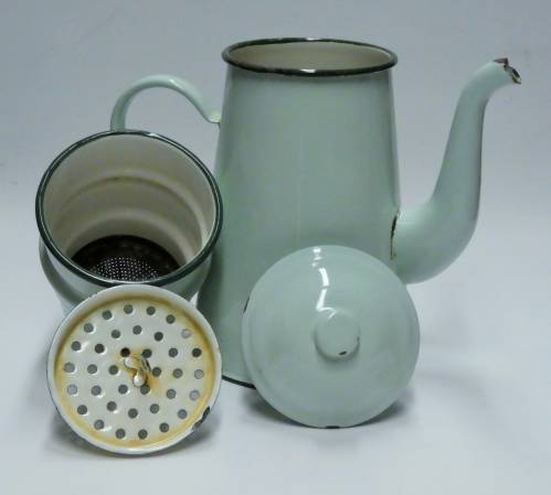 cafetière évasé émaillé vert clair avec manche, couvercle et grand bec verseur en deux parties séparables