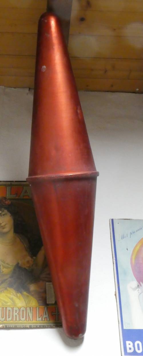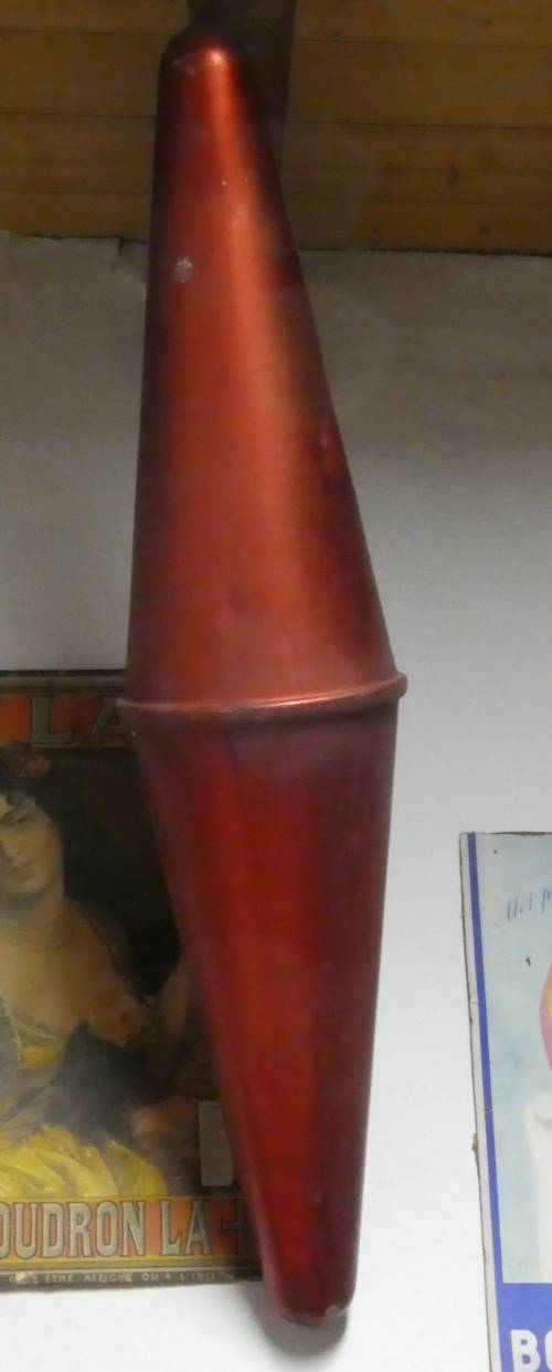 double cone en forme de carotte en métal de couleur rouge orangé la "carotte" est le signe distinctif des débits de tabac. au XVII ème siécle , l'usage du tabac commence à se répande. A cette époque on nommait "quarotte" un ensemble de 7 à 8 feuilles de tabac roulées entre elles. Elle fut d'abord accorchée à l'intérieur de la boutique puis on en fit des iùmitations en tole, en bois ou en porcelaine qu'on suspendit à l'extérieur