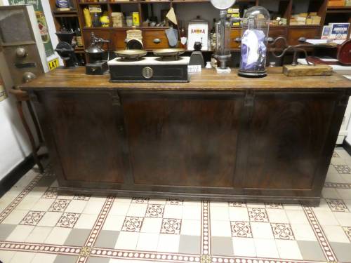 comptoir d'épicerie en bois avec étagére derrière