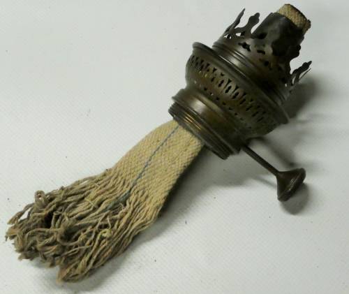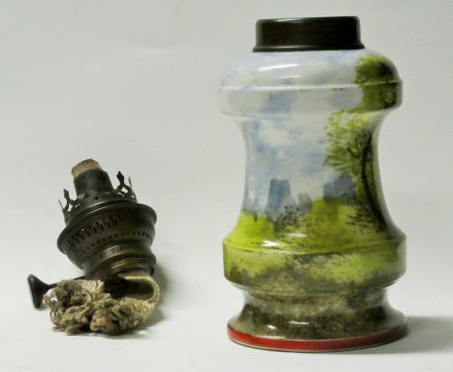 lampe à pétrole composé d'une partie basse en porcelaine (décor arbre,moulin,rocher) et en partie haute d'un bruleur amovible à méche réglable (manque le verre)