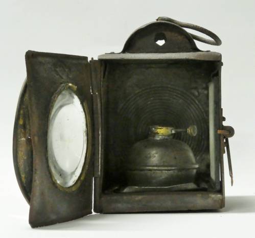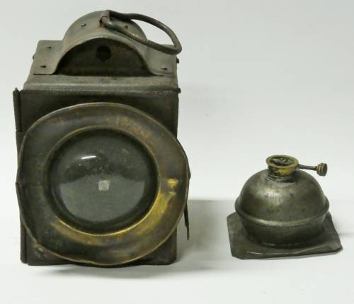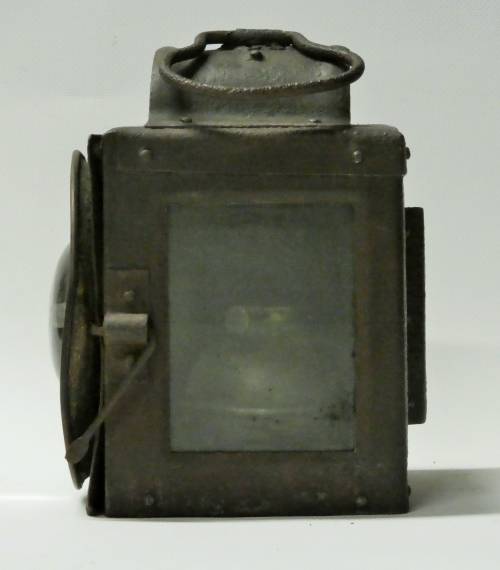 Lanterne cubique équipé d'une grosse lentille, bruleur à pétrole amovible, cheminée pour évacuation des fumées, poignée de transport et accroche sur l'arrière et le coté