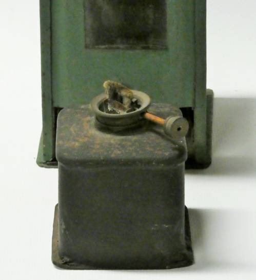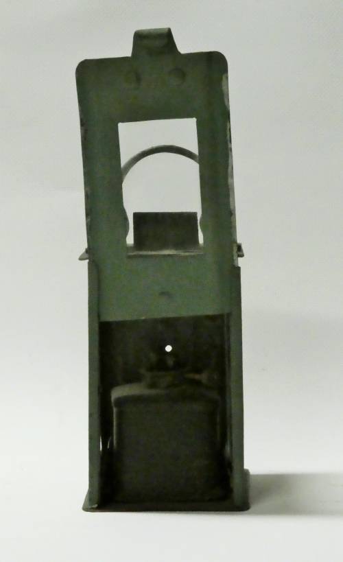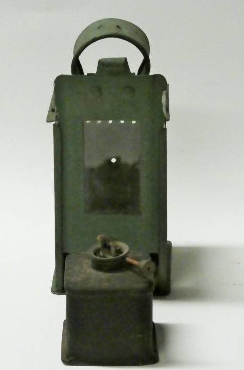 lanterne verte rectangulaire avec porte coulissante verticalement, bruleur à pétrole avec méche réglable (poignée de transport manquante) façade et 2 cotés munis d'un verre