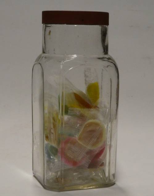 pot en verre avec couvercle métal bordeaux contenant des bonbons coquillages de différentes couleurs