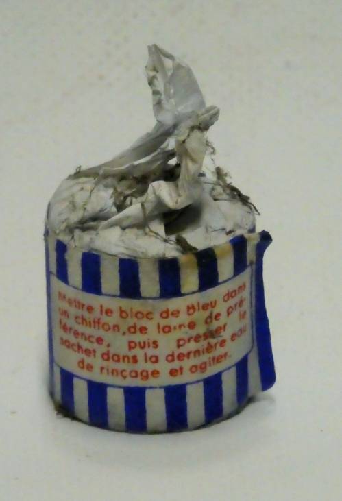 petit sachet rond en tissu entouré d'une bande de papier contenant de la poudre bleu