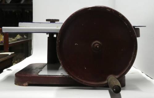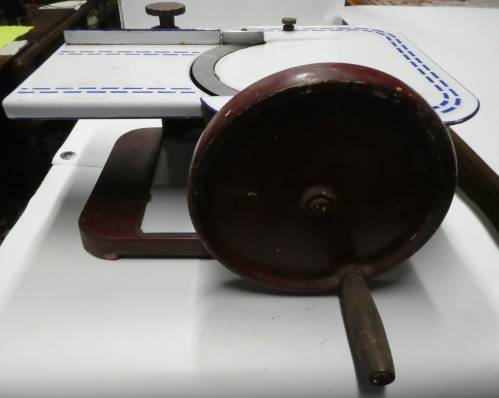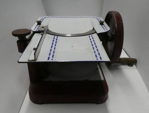 Trancheuse à jambon en métal peint couleur bordeaux et emaille blanc avec volant muni d'un manche en bois