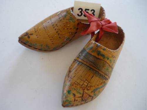 Décor peint polychrome dessin du ,barrage sur le sabot gauche. Sabot droit voir inscriptions