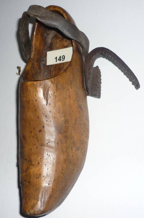 Equipé d'un croc cranté ou machoire en fer forgé et riveté sur le creux entre la semelle et le talon.