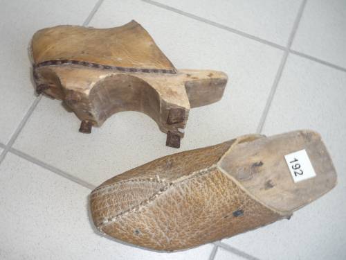 Paire de sabots chinois à semelle hautement portée sur deux "patins" terminés par des renforts métalliques.