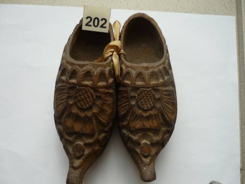Sabots trés richement décorés de sculptures représentant une fleur, de traits, de festons et d'un quadrillage au coeur de la fleur.
