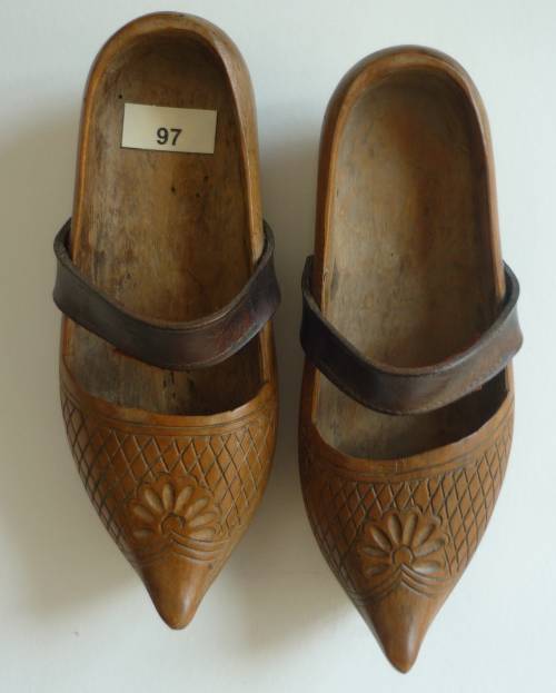 Paire de sabots a bout pointu légèrement relevé, cou de pied souligné de traits à la rainette